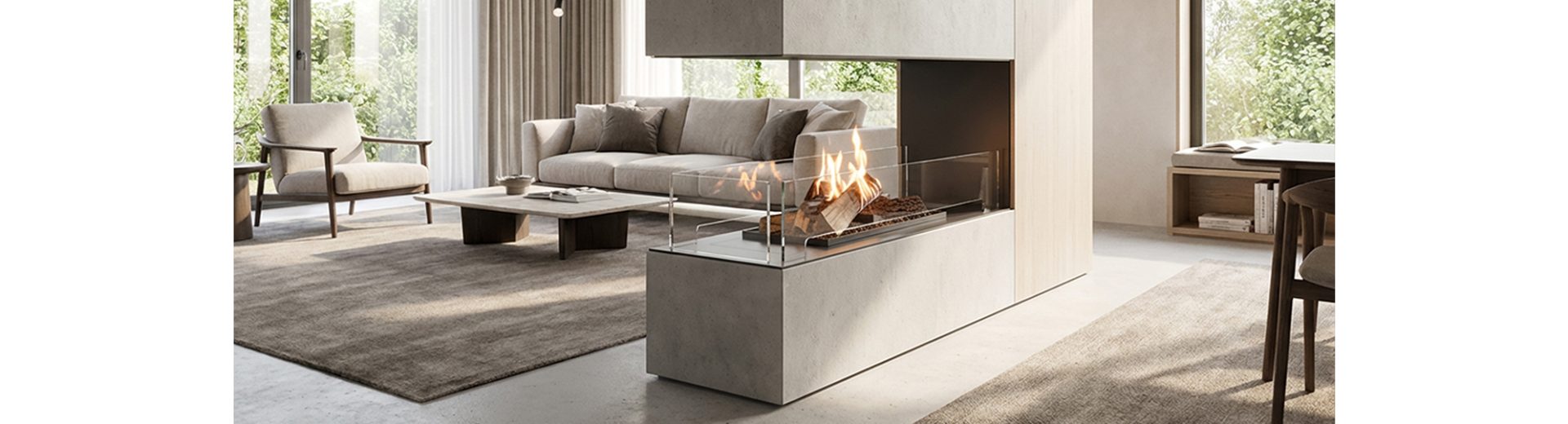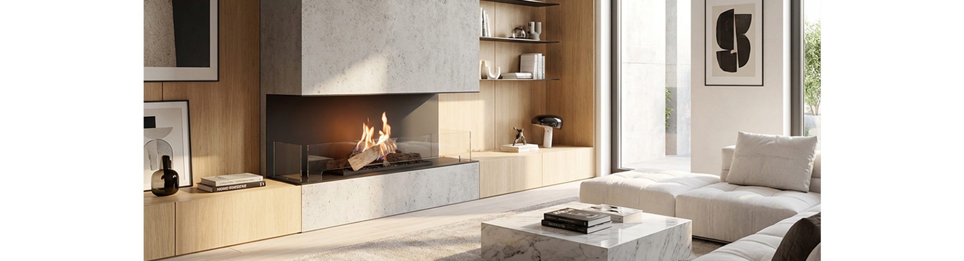 A modern, automatic bioethanol fireplace insert with the look of a traditional fireplace.FLOGS 990 est un insert de cheminée au bioéthanol moderne et automatique, pouvant être installé sans conduit de fumée ni ventilation supplémentaire. Un ensemble de bûches en céramique entourées de flammes hautes et dynamiques crée l’effet visuel d’un foyer traditionnel au bois, tout en garantissant une combustion propre — sans fumée, suie ni autres contraintes liées aux cheminées classiques.