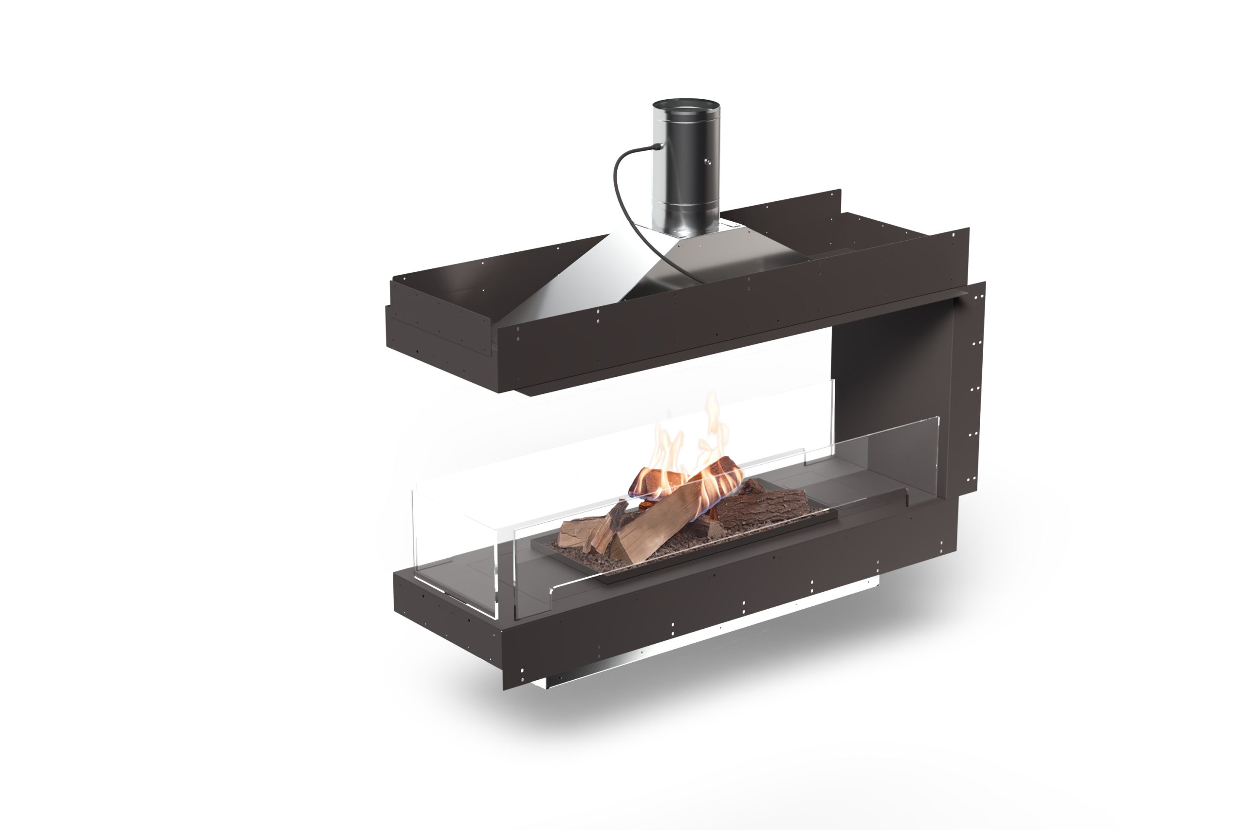 Une hotte intégrée capte l’excès de chaleur et l’évacue vers l’extérieur du bâtiment, permettant à la flamme de rester l’élément central du design tout en maintenant une température intérieure confortable et maîtrisée.